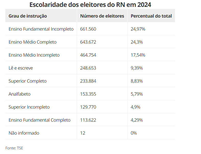 Em números absolutos, são mais de 600 mil eleitores com o ensino fundamental incompleto, representando 24,97% do percentual total e mais de 460 mil potiguares que não concluíram o ensino médio, que somam 17,54%. Nesse percentual estão incluídos também os eleitores analfabetos (5,79%), os que sabem apenas ler e escrever (9,39%) e aqueles com ensino fundamental completo (4,29%).